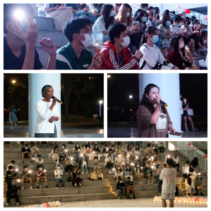《别怕变老》《你听得到》等歌曲迅速燃起现场热烈的气氛,同学们随着音乐的旋律打开手机的闪光灯,点点星光仿佛盏盏明灯,与表演者遨游在美好的音乐之夜。