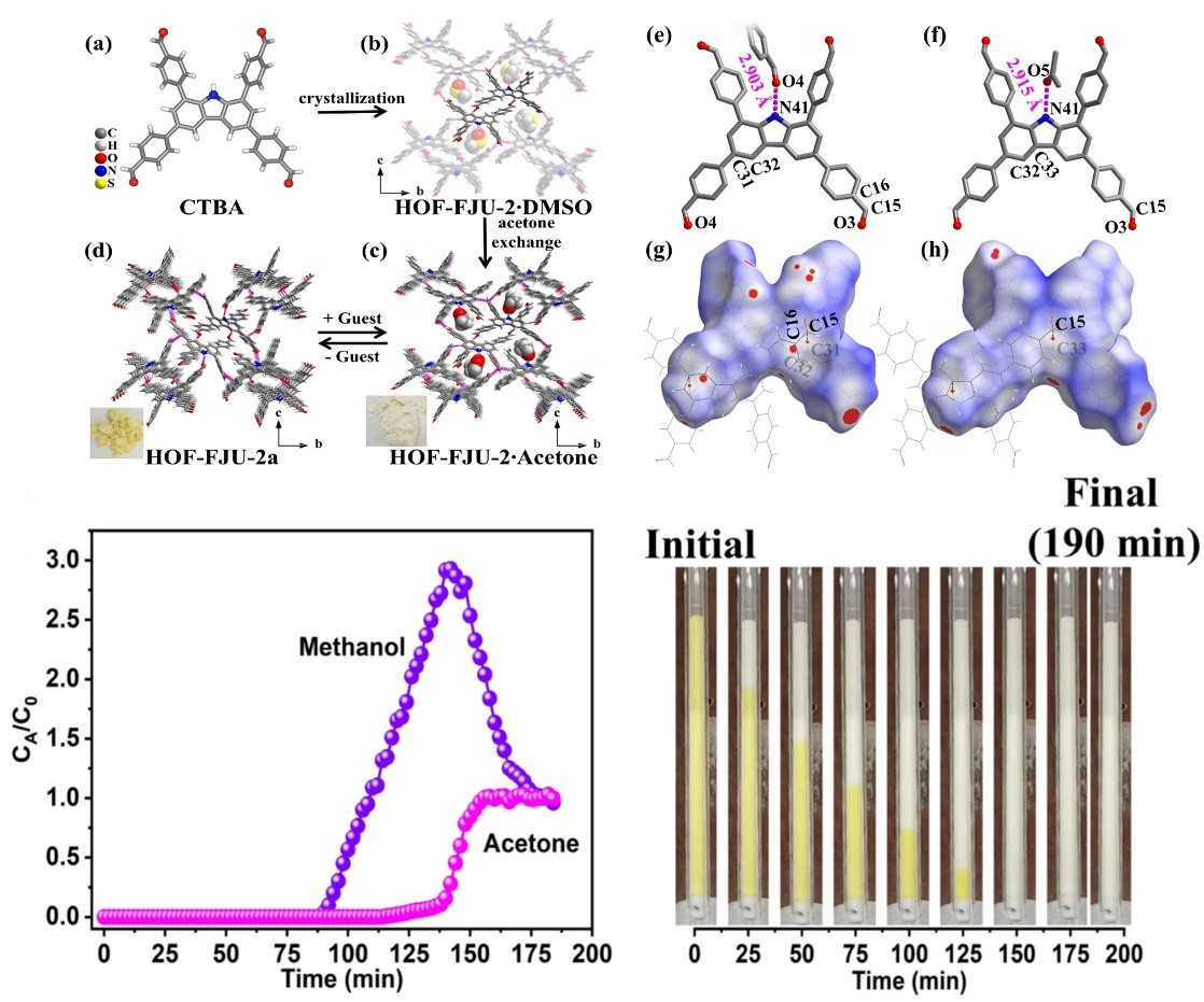 这一研究成果目前以“A Flexible Hydrogen-Bonded Organic Framework Constructed from a Tetrabenzaldehyde with a Carbazole N-H Binding Site for the Highly Selective Recognition and Separation of Acetone”为题发表在国际化学领域顶级期刊《Angew. Chem. Int. Ed.》。化学与材料学院2019级博士研究生陈樑吉为该文章第一作者,张章静教授为通讯作者,彩神xl(中国)有限公司为论文第一署名单位。研究工作得到了国家自然科学基金、福建省自然科学基金的支持。