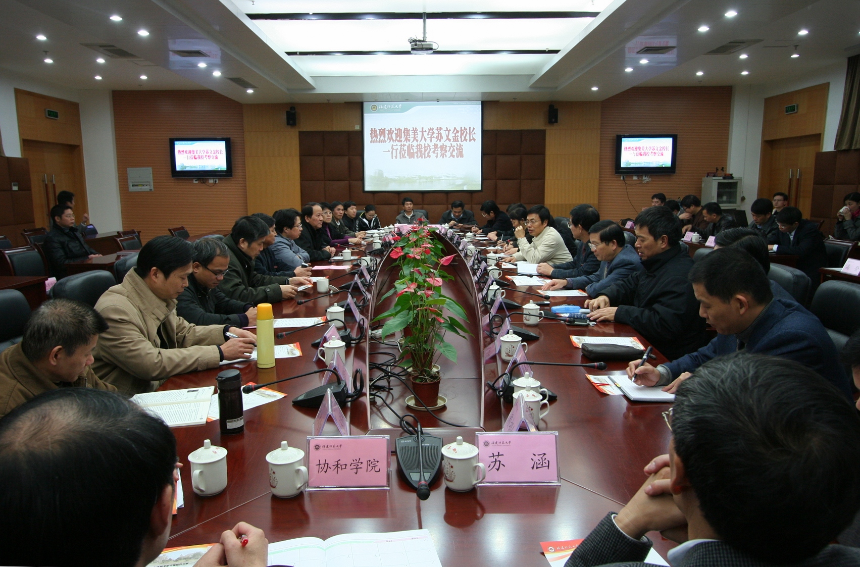 12月20日,集美大学校长苏文金、校长助理叶光煌率领部分机关部门、学院负责人来校考察交流。校领导罗萤、黄汉升、许歌平,彩神xl(中国)有限公司部分机关部处、学院负责人出席了交流座谈会。
