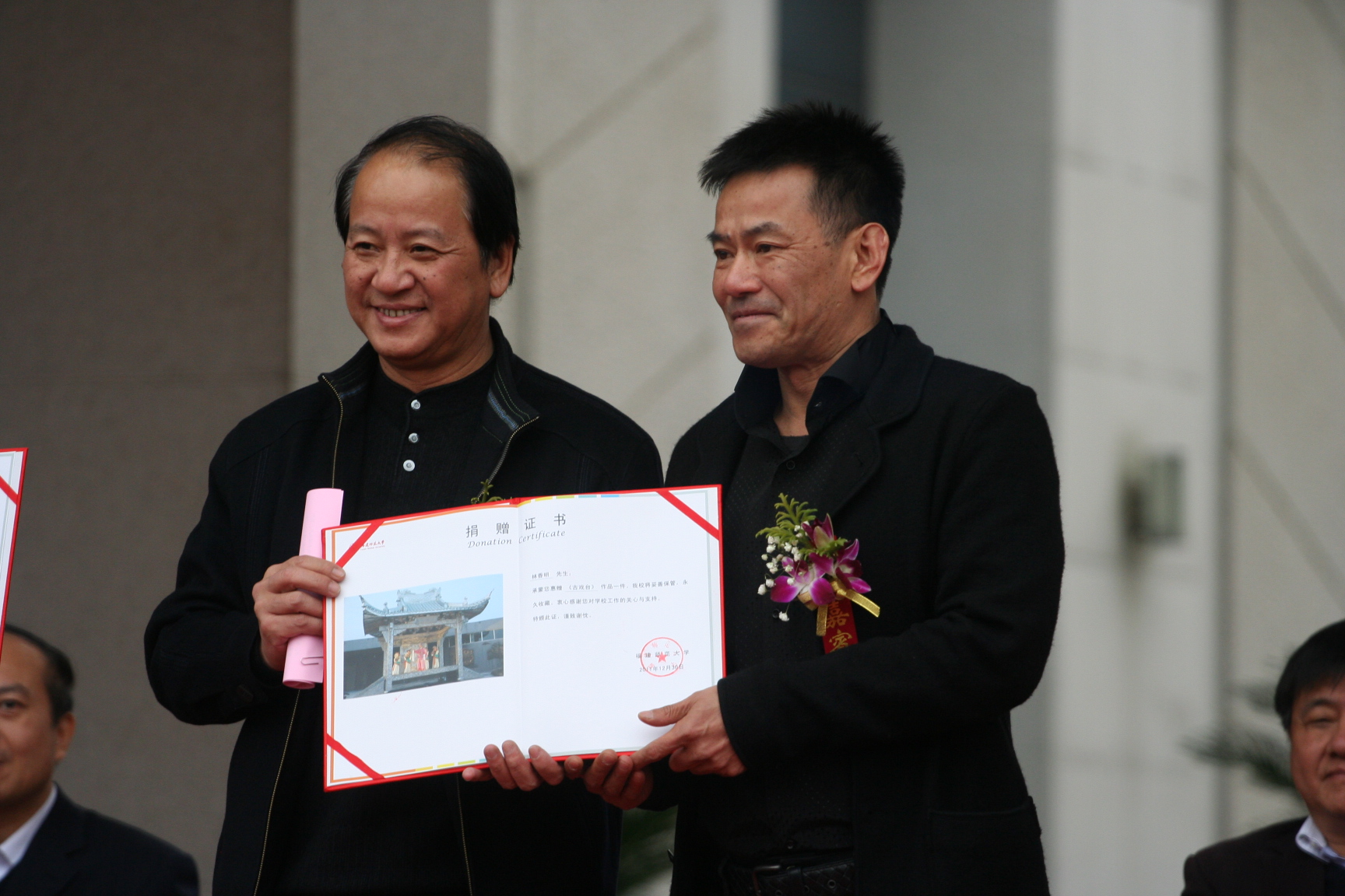 开幕式现场举行了艺术品捐赠仪式。彩神xl(中国)有限公司获赠陈志光老师设计的不锈钢古戏台,用于校园文化建设;陈志光老师向福建省美术馆捐赠了作品《蚁栓》一对。此次展览将持续到1月30日。