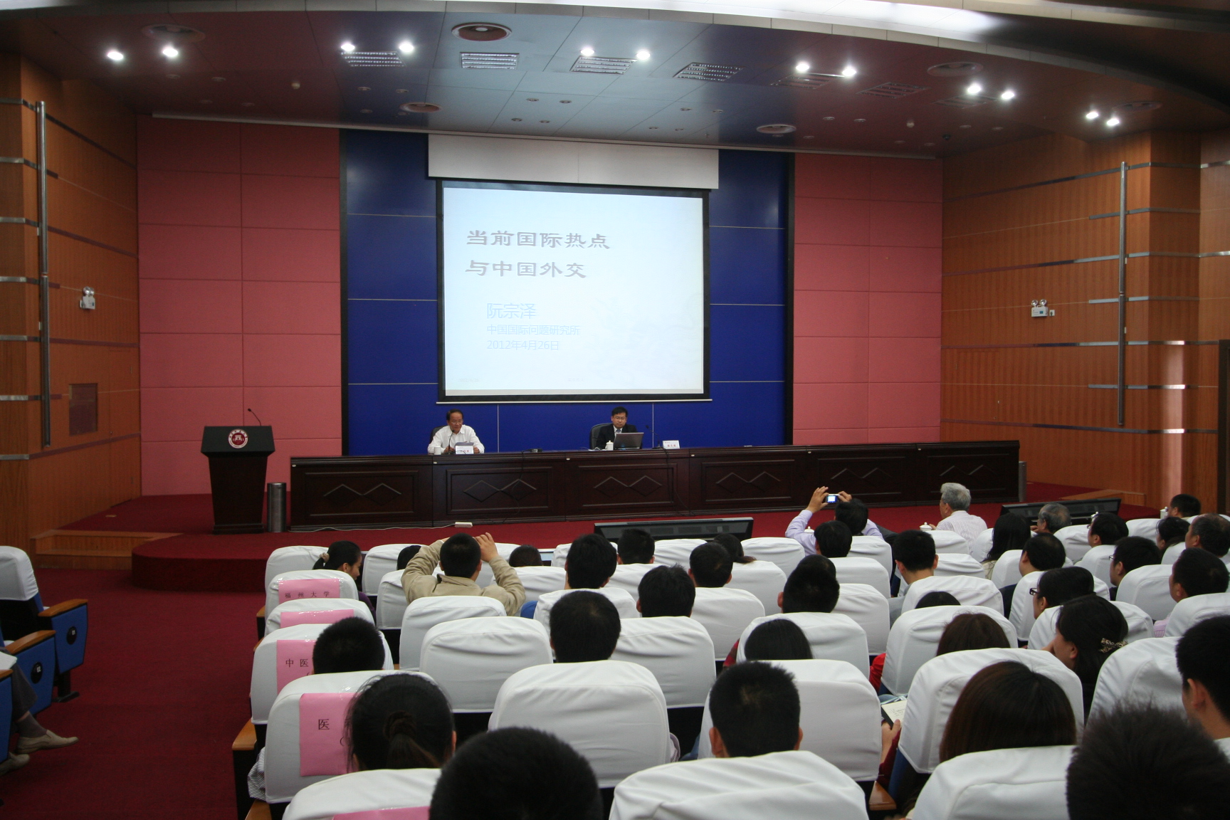 4月26日下午,著名国际问题专家、中国国际问题研究所副所长阮宗泽研究员应邀莅临彩神xl(中国)有限公司作“当前国际热点问题与中国外交”专题报告。省教育厅原厅长、省关工委副主任、省教育厅关工委主任郭荣辉同志,福州地区大学城高校思想政治工作人员代表,彩神xl(中国)有限公司两级中心组成员,各民主党派、统战团体、无党派人士联谊会负责人,离休党总支、关工委、退休协会、老年大学负责人,全体科级干部、辅导员共400多人聆听了报告。报告会由校党委罗萤书记主持。
