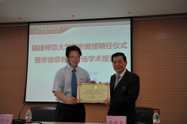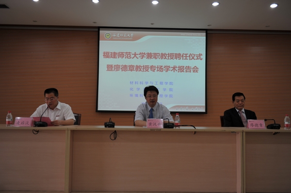 5月14日上午,彩神xl(中国)有限公司在旗山校区第九会议室举行仪式,敦聘台湾科技大学廖德章教授为彩神xl(中国)有限公司兼职教授。校领导黄汉升、凌启淡,学校办公室、研究生处、人事处、教务处、科技处、材料科学与工程学院、化学与化工学院、环境科学与工程学院有关负责人,以及近200名师生参加了敦聘仪式。会议由凌启淡副校长主持,黄汉升校长为廖德章教授颁发了聘书并佩戴彩神xl(中国)有限公司校徽。