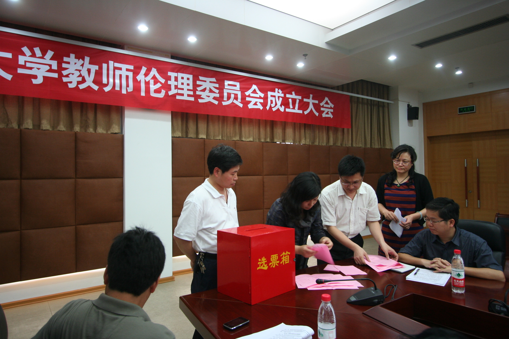 校教师伦理委员会是在校党委领导下,指导学校师德建设的决策咨询、评议和协调机构。其成员由法学专家、伦理学专家、心理学家、教师代表、校友代表和学生代表组成。首届教师伦理委员会委员共23人,是在全校各分党委、党总支、直属党支部推荐初步人选的基础上,经协商酝酿、民主投票选举产生的。