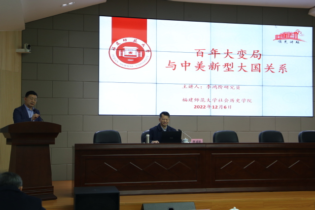 12月6日,社会历史学院邀请福建社会科学院党组成员、副院长、二级研究员、福建省习近平新时代中国特色社会主义思想研究中心特约研究员李鸿阶为师生作题为《百年大变局与中美新型大国关系》学术讲座。讲座由学院副院长孙建党主持,青年教师和研究生100余人参加了讲座。该讲座是学院喜迎115周年校庆系列学术报告之一。