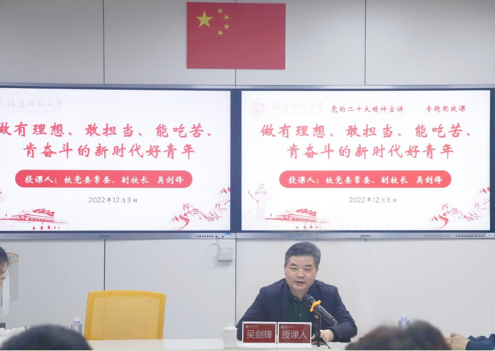 12月8日,副校长吴剑锋以“做有理想、敢担当、能吃苦、肯奋斗的新时代好青年”为题给化学与材料学院本科生上专题思政课,宣讲党的二十大精神。校党委宣传部副部长、文明办主任李彬源,化学与材料学院党委书记兰玉清、副书记邱海锋、辅导员等参加了宣讲报告会。