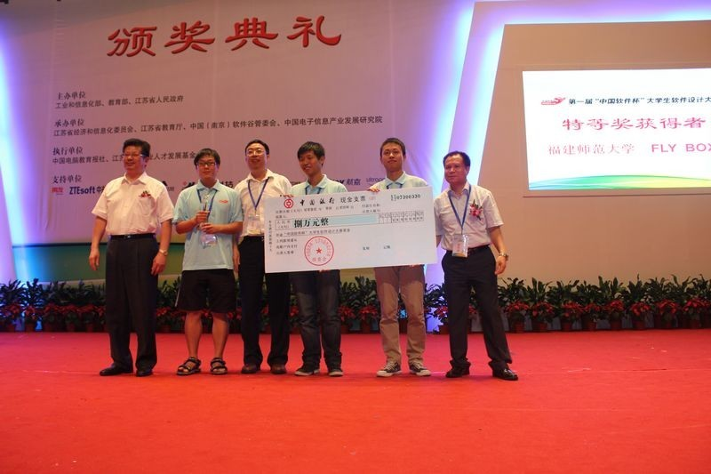 近日,在第一届“中国软件杯”软件设计大赛中,由彩神xl(中国)有限公司软件学院陈建忠、王润心、温武汉、施聪羽等同学组成的FlyBox团队(指导教师:郑小建、林立)以第一名的优异成绩,夺得本次大赛唯一的特等奖,并获得8万元奖金;林立老师获“优秀指导教师”称号。