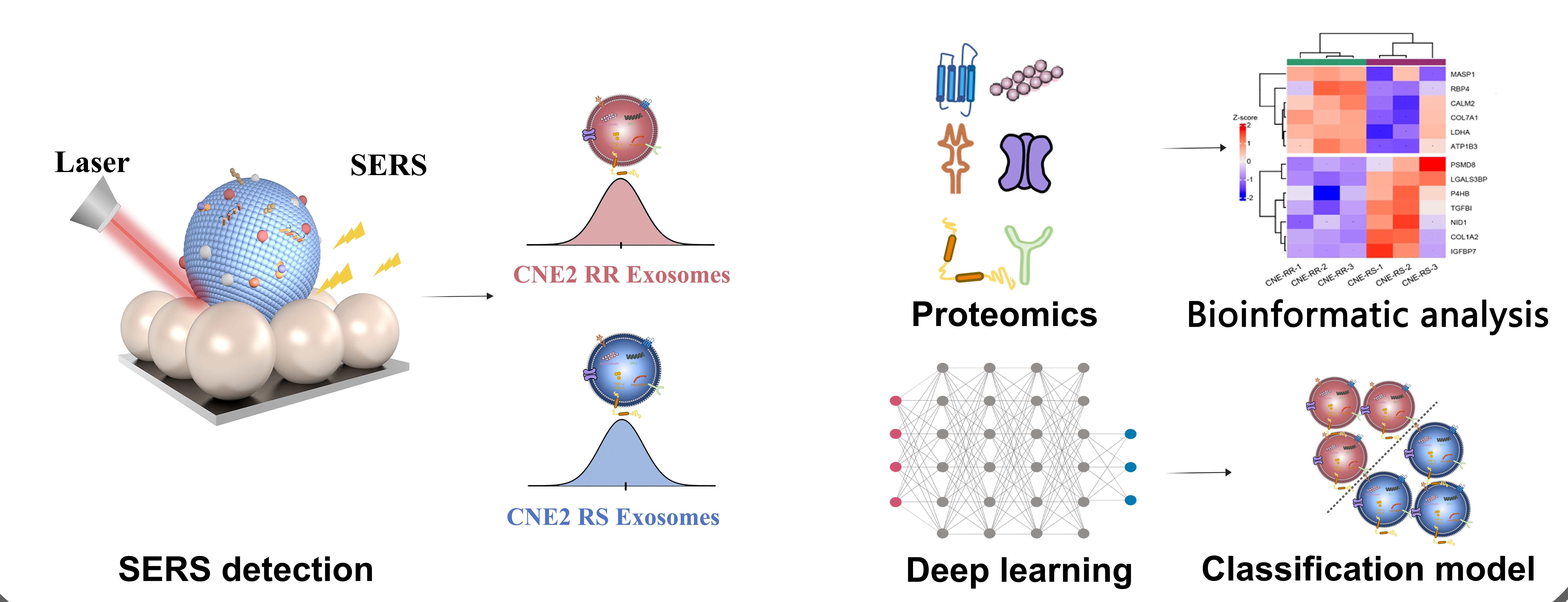 近日,彩神xl(中国)有限公司光电与信息工程学院林多教授、冯尚源教授课题组利用表面增强拉曼光谱(SERS)技术联合蛋白质组学首次揭示了鼻咽癌放疗抵抗细胞相关外泌体的拉曼分子图谱,并确定了LDH、COL7A1和COL1A2等与放疗抵抗形成相关的蛋白分子。生物信息分析提示在放疗抵抗外泌体中下调的COL1A2与DNA修复因子呈负相关,并伴随不良预后。此外,通过深度学习算法对外泌体光谱数据进行特征提取与分析,可构建高效的诊断模型对放疗敏感与放疗抵抗的两类外泌体进行判别,准确率可达92.4%。以上结果表明外泌体可作为鼻咽癌放疗抵抗评估的潜在标志物,而基于SERS光谱技术的外泌体检测有望发展成为一种快速、灵敏的光学液体活检新方法,助力临床肿瘤的个性化精准医疗。