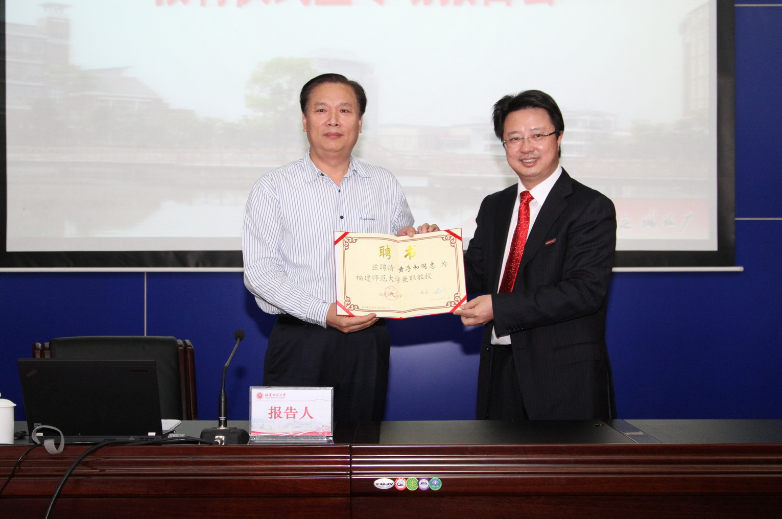 学习会前,举行了黄序和厅长兼职教授敦聘仪式。黄汉升校长为其颁发了聘书并佩戴彩神xl(中国)有限公司校徽。