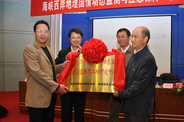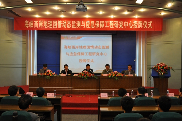 授牌仪式于11月21日在仓山校区邵逸夫楼学术报告厅举行。福建省国土资源厅党组成员、省测绘地理信息局党组书记何清和,省测绘地理信息局局长、省测绘学会理事长陈跃进,总工程师简灿良以及局机关有关处室负责同志,校长黄汉升,学校办公室、科技处、地理科学学院负责同志和师生代表参加了授牌仪式。