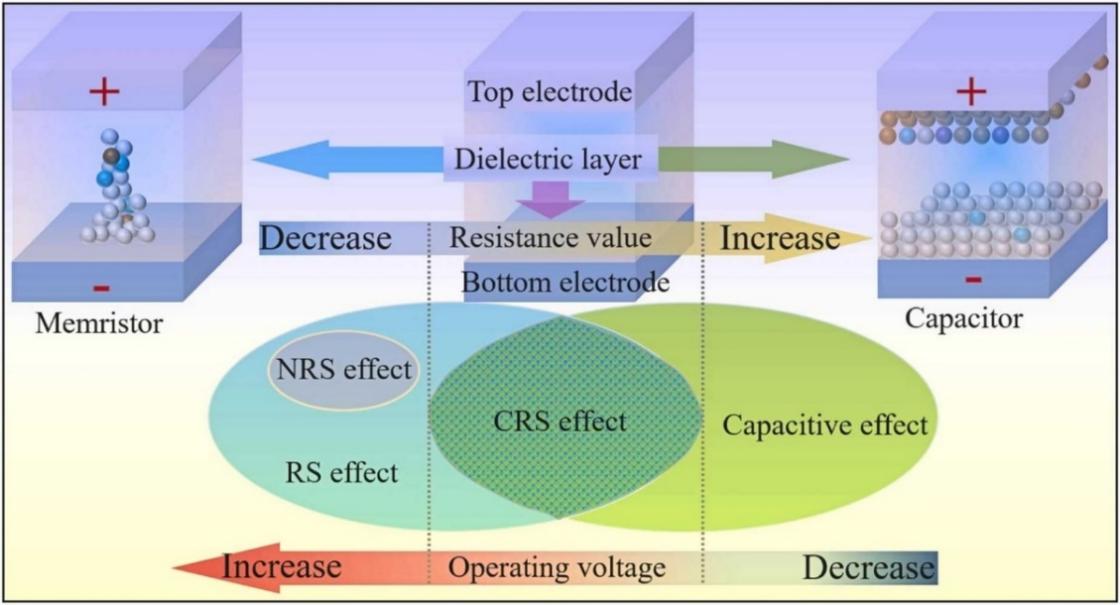 电容耦合忆阻效应为开发新型多功能器件提供了一种有利的方式,因为除了电阻开关(Resistive switching, RS)效应之外,它还同时表现出电容(Capacitive)效应。近日,我院赵勇教授团队通过调控忆阻器件的工作电压范围和介电层介电容量的大小,观察到了电容耦合电阻开关效应(Capacitive-coupled RS, CRS)与负微分耦合电阻开关效应(Negative differential resistance-coupled RS, NRS)的演化。通过深入的机理分析,推断上述演化行为主要归因于忆阻器件的功能层MnO2@TiO2纳米复合材料。随着忆阻器功能层的介电容量的增加,离子和电子的迁移受到阻碍,这削弱了导电细丝(Conductive filaments, CF)的形成,导致大量电子/离子聚集在功能层/电极的界面上,导致内部电场,从而观察到宏观电容效应。因此,这项工作深入了解了CRS和NRS效应之间的演变,为构建用于人工智能应用的超低功耗多功能设备开辟了一条新途径。该研究成果以“Evolution between CRS and NRS behaviors in MnO2@TiO2 nanocomposite based memristor for multi-factors-regulated memory applications”为题发表于《Nano Energy》(IF= 19.069)。该论文第一单位为彩神xl(中国)有限公司,物理与能源学院毛双锁博士为第一作者,赵勇教授和西安交通大学孙柏教授为共同通讯作者。该研究得到国家重点研发计划和彩神xl(中国)有限公司人才项目的资金支持。