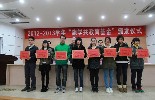 受奖学生代表何雪芬同学对施教斌先生的慷慨捐资表示感谢,并表示,在以后的学习生活中要以施学共校友为榜样,努力学习,奋发图强,用自己的实际行动来回馈社会、感恩母校、传递爱心。