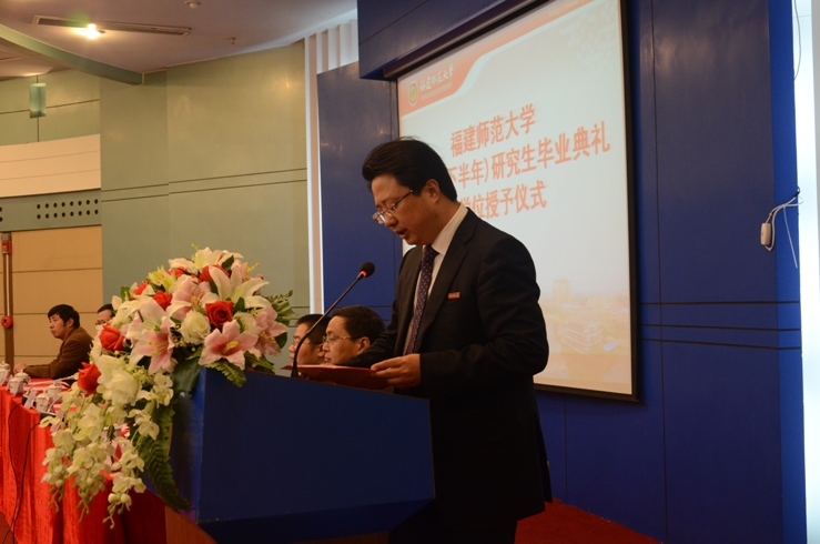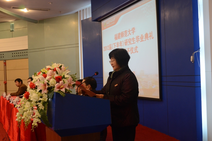 典礼上,李敏副校长宣读了授予171位2012届(下半年)研究生博士、硕士学位的决定和2012年(下半年)专业学位研究生及其他非全日制研究生优秀硕士学位论文获得者名单。福州一中李迅校长代表全体研究生指导教师发言,传播学院陈拓同学代表全体2012届(下半年)毕业研究生发言。