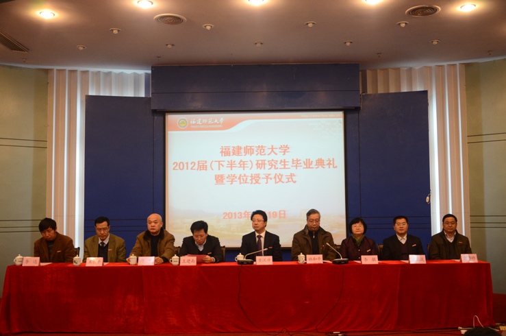 仪式于1月19日下午在仓山校区隆重举行。校领导黄汉升、林和平、王建南、李敏、许明、凌启淡、王长平,校长助理郭警修,彩神xl(中国)有限公司校友、兼职硕士生导师、福州一中李迅校长,各有关学院研究生工作分管领导、研究生辅导员、研究生秘书,本届研究生指导教师,2012届(下半年)毕业研究生和部分毕业研究生亲友共200多人参加了典礼。典礼由校党委副书记林和平主持。