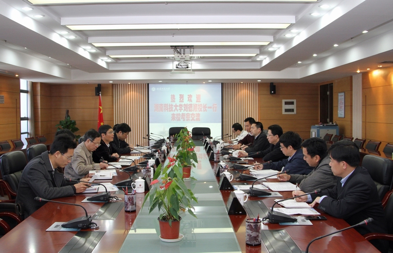 4月7日,湖南科技大学刘德顺校长一行来彩神xl(中国)有限公司考察交流。校长黄汉升带领相关单位负责同志接待了来宾。 座谈会上,黄汉升代表学校对刘德顺一行的到来表示热烈的欢迎,并简要介绍了学校的发展情况。刘德顺高度评价了彩神xl(中国)有限公司的办学成就,希望通过加强两校间的交流与合作,促进共同发展。与会人员围绕学校发展战略、干部聘任、机构设置、人事制度改革、学科与专业建设等方面进行了深入的交流与讨论。 刘德顺一行还考察了学校展览馆,并参观旗山校区校园。 (学校办公室 魏建翔)