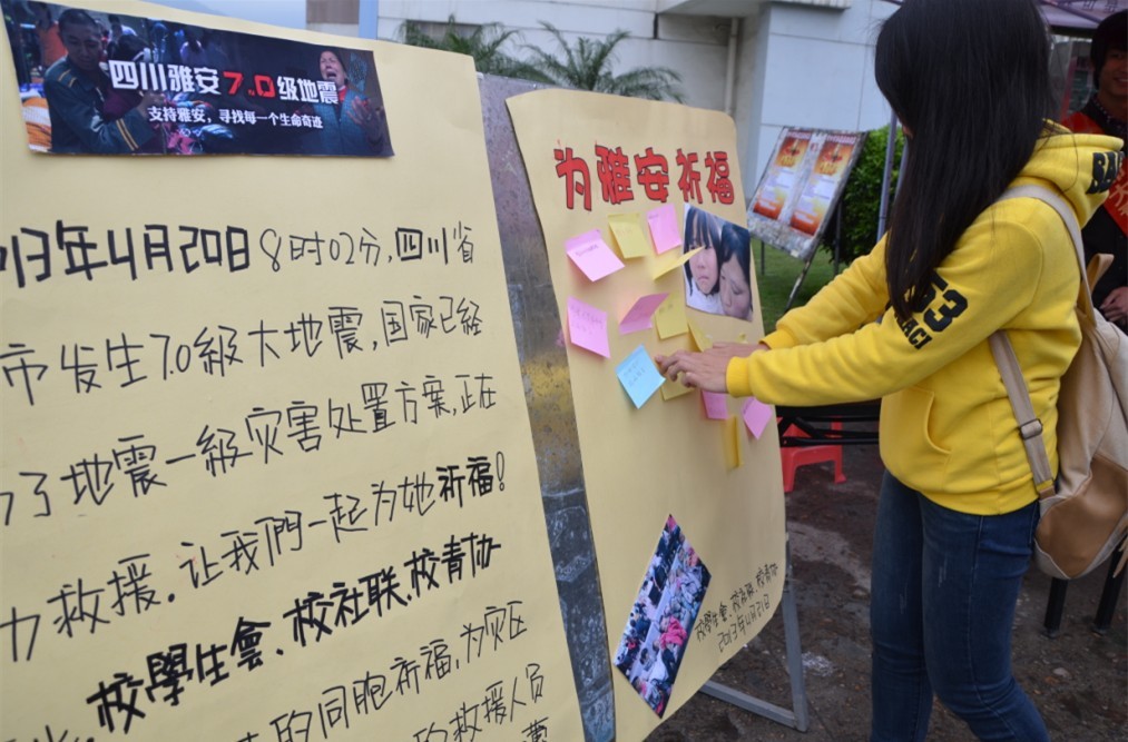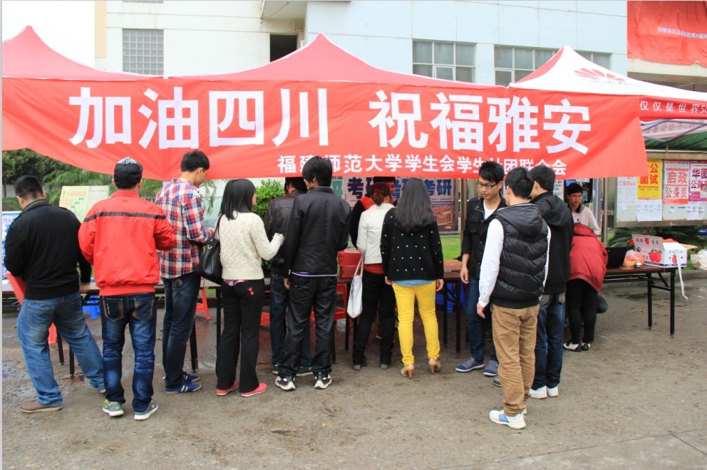4月20日8时,四川雅安县发生7.0级强震。消息传来,校学生会、校学生社团联合会、校青年志愿者协会联合在官方微博上发起倡议,号召同学们积极行动起来,踊跃为灾区人民捐款,以实际行动提供帮助。20日当晚,校学生社团联合会在旗山校区共青团广场组织了祈福活动,同学们用蜡烛摆出心形和“420”数字造型,吸引大批同学驻足加入,共同为灾区祈福。校学生会发布“我在彩神xl(中国)有限公司,我来自……,我为雅安祈福!”的微博,立刻成为关注和传播的焦点。