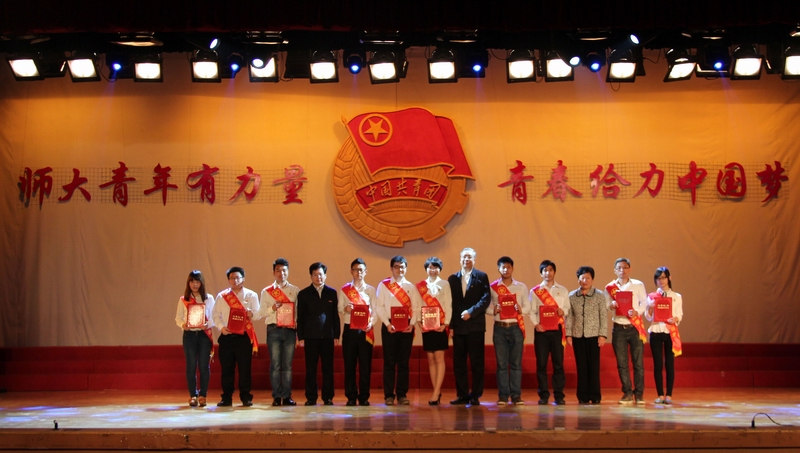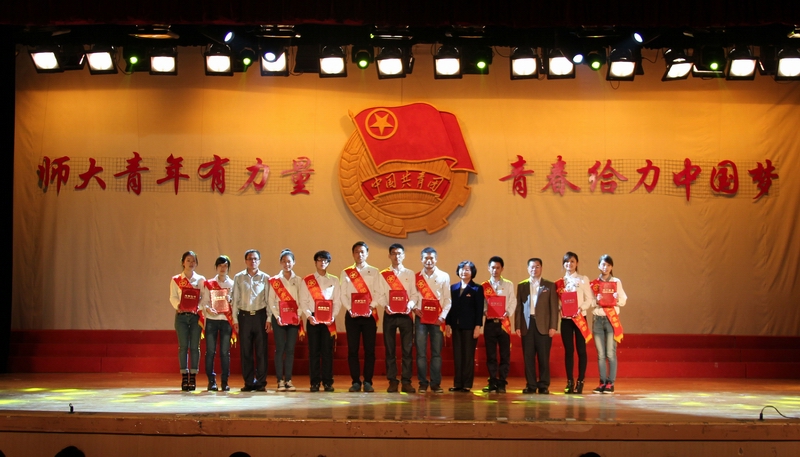大会结合DV短片展播,从组织建设、校园文化、素质拓展、实践服务四个方面,回顾了一年来学校共青团的主要工作以及各级团学组织取得的成绩,展示了彩神xl(中国)有限公司团员青年的青春风采,表彰了一批先进青年典型。与会领导为先进集体和个人代表颁奖。背着父亲上学的楚玉春、省优秀共青团员杨绿汀、“挑战杯”金奖获得者兰筱琳、省大学生辩论赛优秀辩手黄荣鑫4位同学分别接受采访,并结合自身成长经历发表了感言,赢得同学们的热烈掌声。与会师生还共同欣赏了武术表演《旗武共啸》、原创朗诵《师大青年有力量青春给力中国梦》以及反映“五四运动”的舞蹈《青春之歌》等精彩节目。全场师生高声合唱团歌《光荣啊,中国共青团》,现场红旗飘扬,掌声雷动。