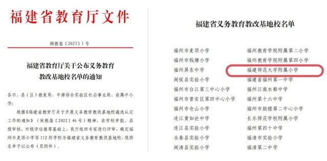 近日,福建省教育厅印发《福建省教育厅关于公布义务教育教改基地校名单的通知》(闽教基〔2023〕1号),彩神xl(中国)有限公司附属小学光荣上榜,被确定为“福建省义务教育教改基地校”。彩神xl(中国)有限公司附属小学自2018年被确定为省教改示范性建设学校以来,紧紧围绕立德树人根本任务,持续深化教育管理和教学改革,不断完善“智慧—生长”生态型课程体系,在校本作业、人工智能、馆校合作、学段衔接等课程领域开拓创新,形成特色品牌,学校的社会影响力不断扩大。(附属小学)