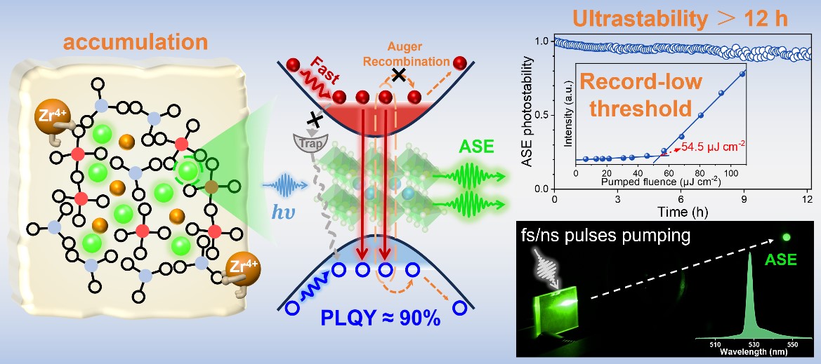 鉴于此,彩神xl(中国)有限公司陈大钦教授课题组基于ZrO2添加剂缩聚玻璃网络结构,抑制量子点在玻璃中不可控自析晶,促进高质量、致密均匀的原位析晶。团队进一步利用飞秒瞬态吸收光谱深入揭示了该策略有效减少缺陷态、抑制俄歇复合、加快热载流子弛豫,从而促进粒子数反转产生光放大。最终,在飞秒激光泵浦下实现了具有创纪录低阈值(54.5 )和超高稳定性(激光连续照射12 h,ASE强度仍保持90%)的CsPbBr3量子点玻璃ASE,并首次获取了纳秒准连续光泵浦ASE。该工作为实现高性能钙钛矿量子点玻璃激光奠定了基础。