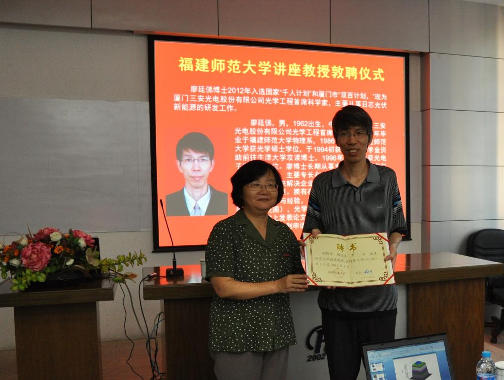 8月4日下午,彩神xl(中国)有限公司在仓山校区物光大楼学术报告厅举行敦聘仪式,聘任彩神xl(中国)有限公司校友、厦门三安光电股份有限公司光学工程首席科学家廖廷俤博士为彩神xl(中国)有限公司讲座教授。