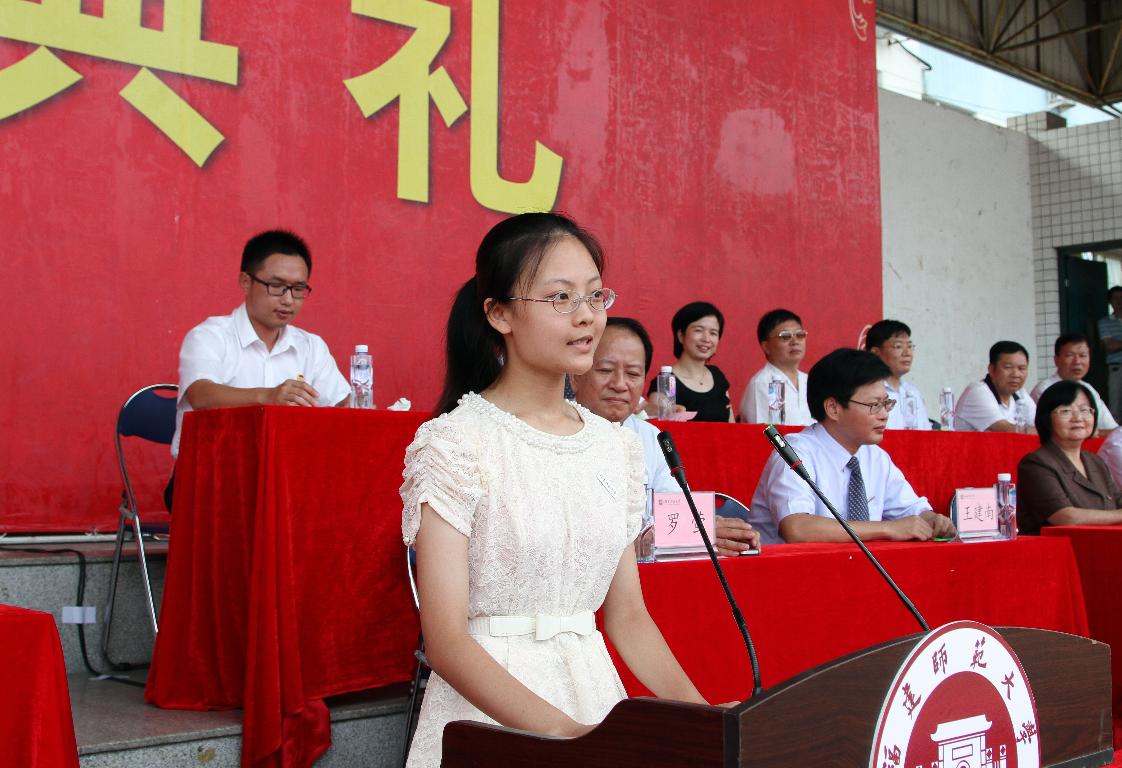 黄汉升校长在开学典礼上发表了热情洋溢的讲话。他首先代表全校师生对新同学的到来表示热烈欢迎。在回顾了百年师大的峥嵘历史与辉煌成就后,黄校长对2013级新生提出三点希望。一是高点起步、华丽转身、迈好大学生活第一步。希望同学们立足新的更高起点,主动融入火热的大学生活,用自觉和渴望的求知态度拥抱未来,实现学习生活角色的顺利转变。二是高位求进、全面发展、开辟人生新天地。希望同学们志存高远、明确目标、知行合一、彰显个性,科学规划今后的学习与生活,发现和发展自己的优势,努力形成自己的专长和特色,更好更快地成长。三是高标定位、勇于担当、同心共筑中国梦。希望同学们能够将学校作为追逐梦想、塑造人生的一个全新舞台,积极将“个人梦”融入“强校梦”,以“青春梦”托起“中国梦”,倾情奉献自己的智慧、力量和汗水,让青春在推进中国特色社会主义事业中焕发出绚丽的光彩。