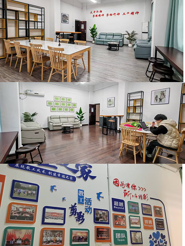 “教师驿站”占地120㎡,规划有学术交流区、休憩充电区、文化展示区及自助服务区四大功能模块,配备有沙发、书桌、图书角、午休折叠床、茶具等设施,同步打造教职工活动主题文化墙,致力于为教职工提供集学习研讨、休憩阅读、文化浸润于一体的高品质共享空间。