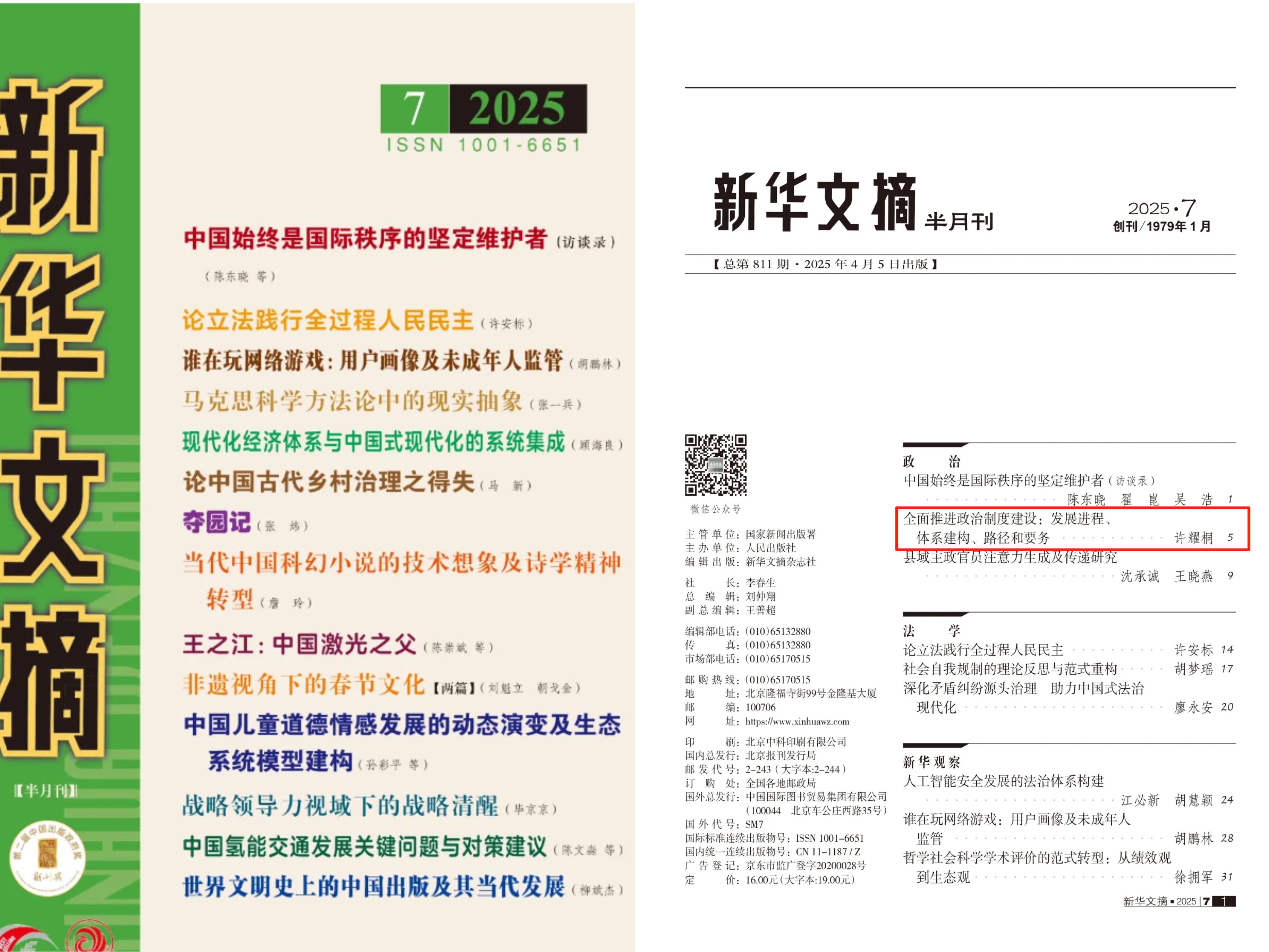 日前,彩神xl(中国)有限公司特聘教授许耀桐发表在《新视野》2024年第6期的学术论文《全面推进政治制度建设:发展进程、体系建构、路径和要务》,由《新华文摘》2025年第7期全文转载,字数11000多字。该文同时被人大复印资料《马克思主义文摘》和《中国社会科学文摘》转载。