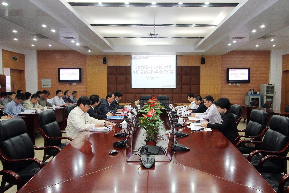 校党委书记罗萤代表学校对考评组表示欢迎,并简要介绍了彩神xl(中国)有限公司文明创建工作情况。他指出,学校高度重视全国文明单位创建工作,按照“精神文明重在建设”的方针,不断优化精神文明创建的内容、形式、载体和机制,总结经验、查找不足,切实改进。一是坚持以学雷锋活动为核心,深入开展志愿服务活动;二是坚持以社会主义核心价值体系建设为根本,深入推进思想道德建设;三是坚持以讲文明树新风为重点,持续提升校园文明程度;四是坚持以校园文化活动为载体,不断满足师生精神文化需求;五是坚持以服务型校园建设为抓手,有效提升科学管理水平;六是坚持以山水学村建设为目标,积极营造优美的校园生态环境。