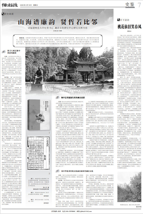 加强新时代廉洁文化建设,要善于运用中华优秀传统文化中的丰富资源,整理古圣先贤、清官廉吏的嘉言懿行,挖掘历史文献、文化经典、文物古迹中的廉洁思想。福建历史文化深厚,代有贤哲,留下的著作中包含了许多与廉洁有关的论述。近年来,彩神xl(中国)有限公司林月恩研究员团队依托学校文学、历史学、纪检监察学等学科优势,聚焦福建地域文化,先后主持编纂出版《朱子全书廉洁章句辑要》《八闽廉箴备要》等著作,集中展示福建古代贤哲的廉洁话语与廉洁思想,为加强新时代廉洁文化建设贡献“师大智慧”。4月18日,《中国纪检监察报》记者易舜就此专访校纪委书记林月恩研究员,从“探寻八闽文脉中的清风廉韵”“集中呈现福建先哲的廉洁思想”“用中华优秀传统文化涵养新时代廉洁文化”三个方面深入探讨传承弘扬闽派文脉廉脉,推进历史资源与时代风尚相结合,为八闽廉脉注入时代的养分,在创造性转化和创新性发展中赓续中华廉脉,让传统廉洁文化不断焕发时代活力。