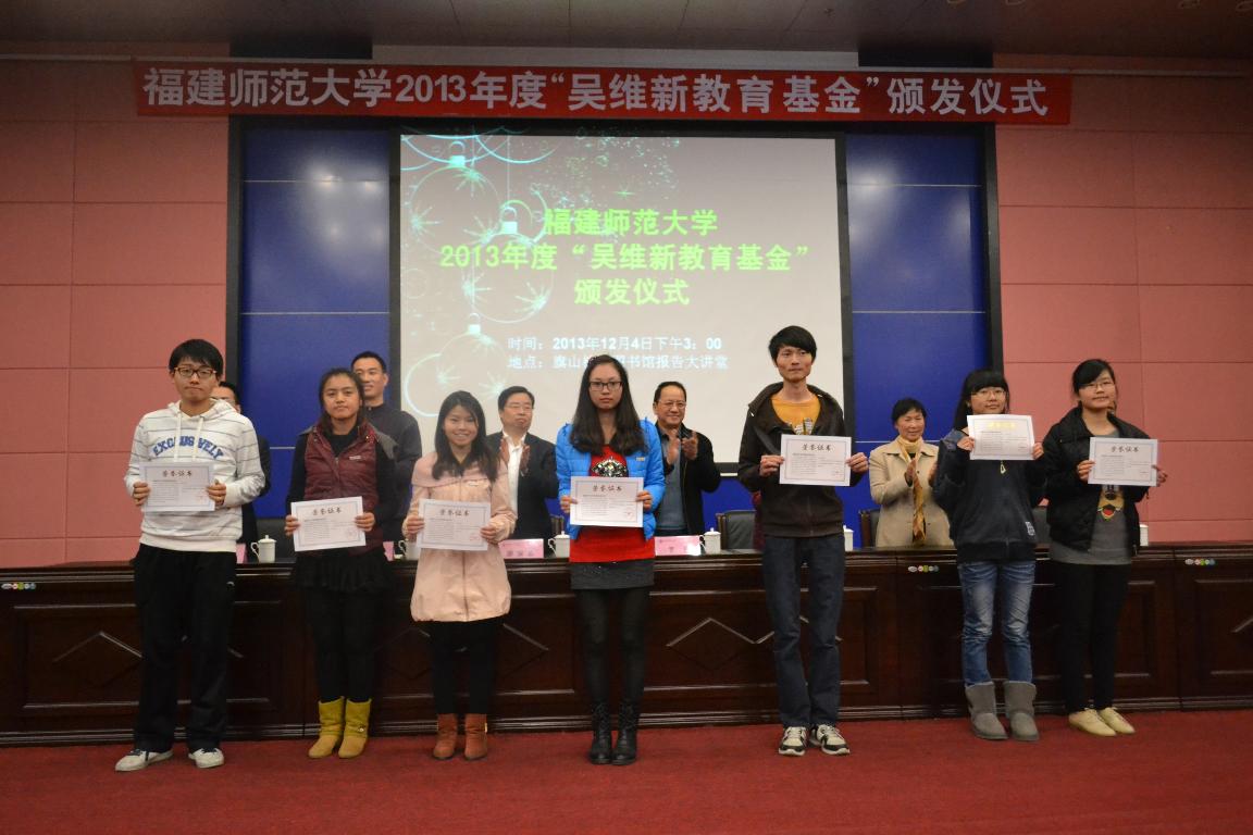 学工部负责人宣读了2013年度彩神xl(中国)有限公司吴维新教育基金奖助学金获得者名单。与会领导为他们颁发了奖状和奖金。吴必萍、郑德城、黄健3位同学分别代表获奖、受助和竞赛获奖同学发言,表达了对吴维新先生的感激之情和拼搏自强的决心。