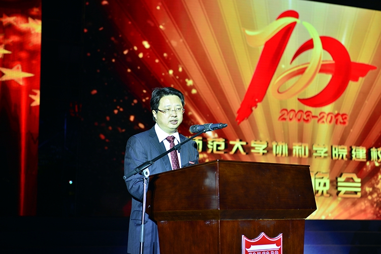 黄汉升校长代表学校致辞,希望协和学院全体师生员工以校庆为契机,改革创新谋发展,凝心聚力促跨越,早日把学院建成一所高水平、有特色、省内一流、全国知名的独立学院,为实现“师大梦”、“教育梦”和中国梦作出新的贡献。