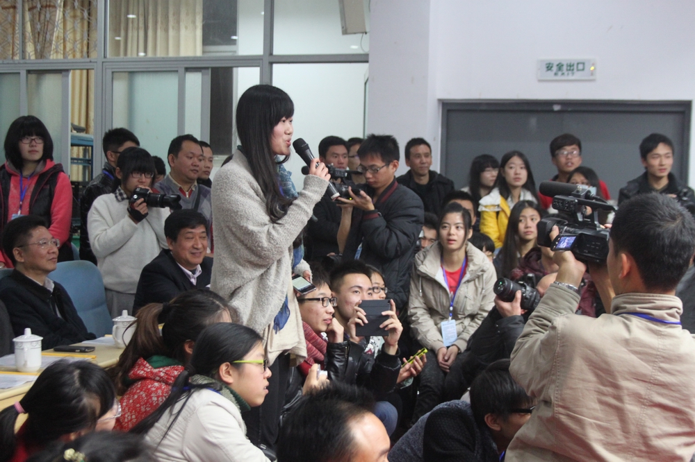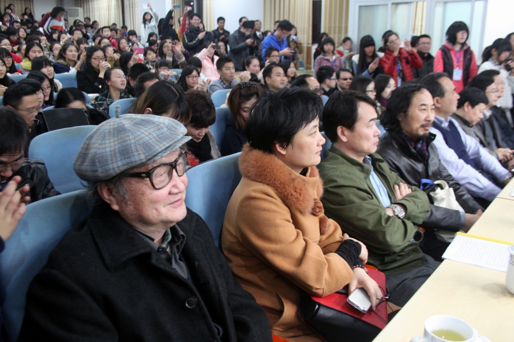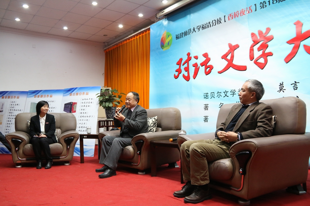 12月26日下午,2012年诺贝尔文学奖得主莫言,著名作家苏童、格非应邀走进福清分校,与文学爱好者和读者见面。晚上,莫言、格非作客学生访谈节目“香樟夜话”,与师生近距离对话。北京师范大学过常宝教授、张清华教授、苗绿博士、张吾龙教授等学者,省市作协部分成员,福清市委市政府领导,祥兴箱包集团代表,师生代表等300多人参加了活动。