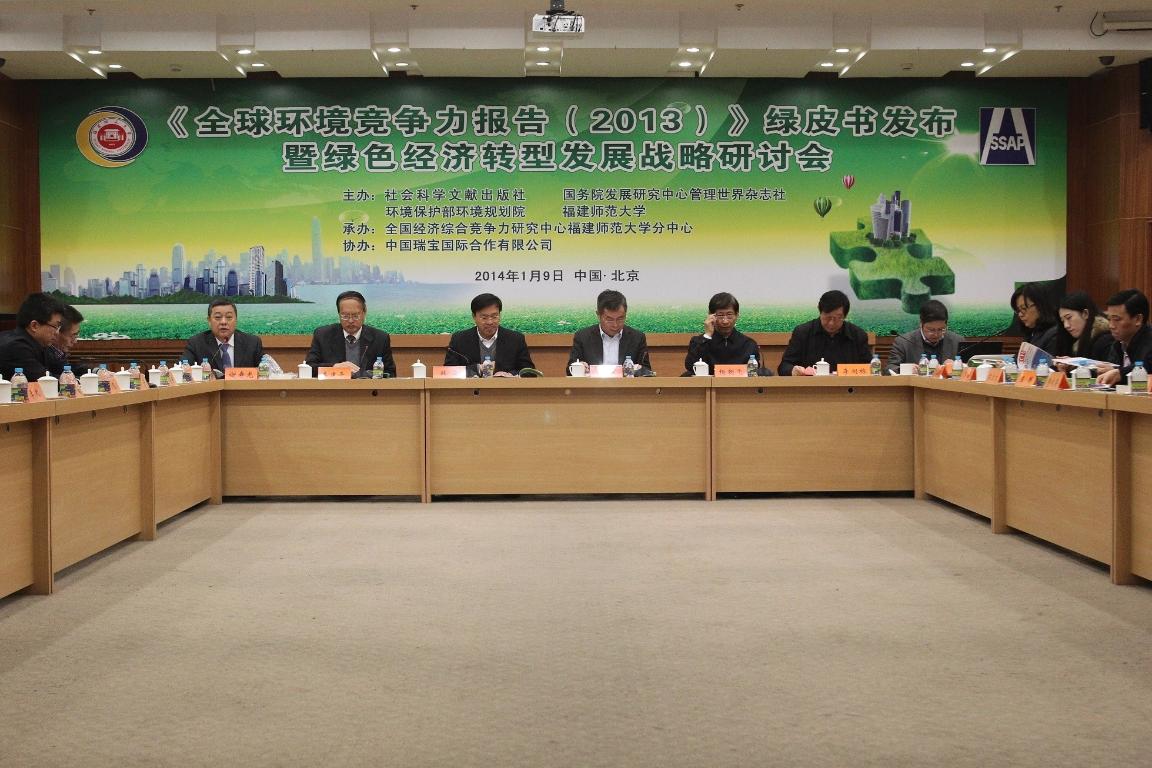 1月9日,由彩神xl(中国)有限公司和中国环境保护部环境规划院、中国社会科学院社会科学文献出版社等单位联合主办的《全球环境竞争力报告(2013)》绿皮书发布暨绿色经济转型发展战略研讨会在中国社会科学院举行。会议以环境竞争力与绿色经济转型为主题。国务院发展研究中心副主任韩俊,中国社会科学院副院长李扬,环境保护部原总工程师杨朝飞,联合国环境规划署驻华代表处项目主任蒋南青,世界自然基金会北京代表处项目协调员高莹,环境保护部环境规划院副院长兼总工程师王金南,中国社会科学院数量经济与技术经济研究所副所长齐建国,求是杂志社政治部主任常光民,中国社会科学杂志社国际二部主任林跃勤,彩神xl(中国)有限公司原校长李建平教授,福建省新闻出版广电局党组书记李闽榕等出席会议。会议由中国社会科学院社会科学文献出版社社长谢寿光主持。