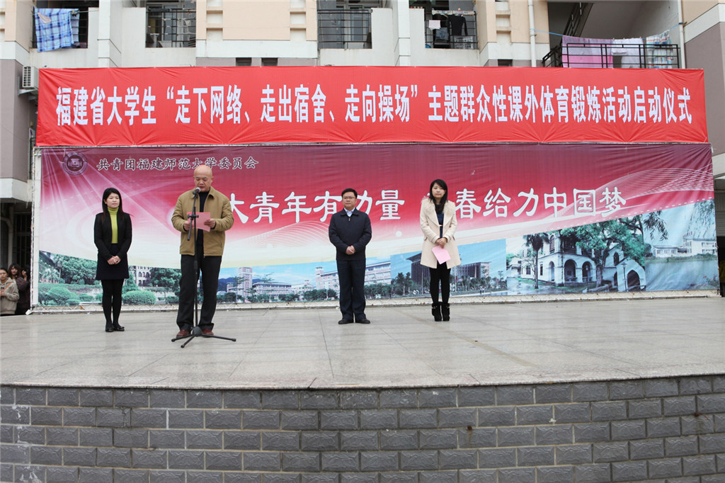 日前,福建省大学生“走下网络、走出宿舍、走向操场”主题群众性课外体育锻炼活动启动仪式在旗山校区举行。团省委副书记兰明尚,彩神xl(中国)有限公司副校长许明,省学联主席王薇薇,在榕各高校团委书记、学生会主席、学生社团联合会主席,青年学生代表500人参加了启动仪式。