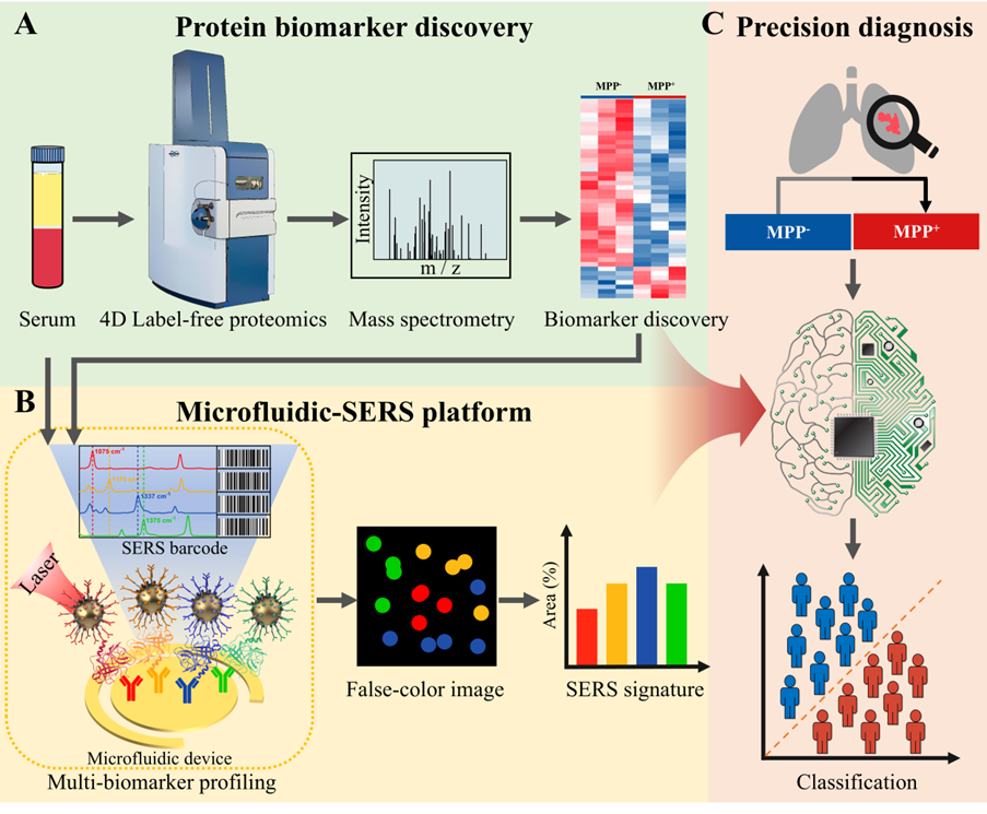 针对这一临床需求,彩神xl(中国)有限公司王静研究员团队开创性地采用多组学整合研究策略:首先通过4D非标记定量蛋白质组学技术,系统鉴定了MPP⁺与MPP⁻ LUAD患者血清中的44个差异表达蛋白,并运用生物信息学方法筛选出4个最具诊断潜力的MPP亚型特异性蛋白标志物;进而自主研发了高灵敏度的微流控表面增强拉曼散射(SERS)检测平台,实现了这4种血清标志物的精准定量检测。