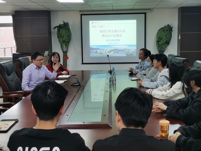 近日,化学与材料学院在理工楼4楼会议室开展“话出心‘材’”——校园文明交通大讨论暨金点子征集会。院党委副书记邱海锋,2019级辅导员和部分学生参加活动。