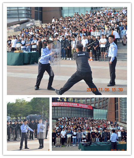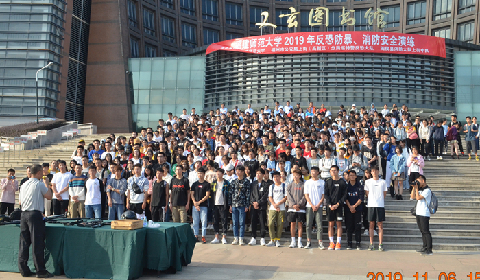 11月6日,彩神xl(中国)有限公司年度反恐防暴、消防安全演练在旗山校区图书馆前广场举行。演练由校保卫处联合福州市公安局上街(高新区)分局巡特警反恐大队、闽侯县消防大队上街中队共同举办,各学院学生代表、后勤服务集团员工、保安队员等400多名师生参加了演练。
