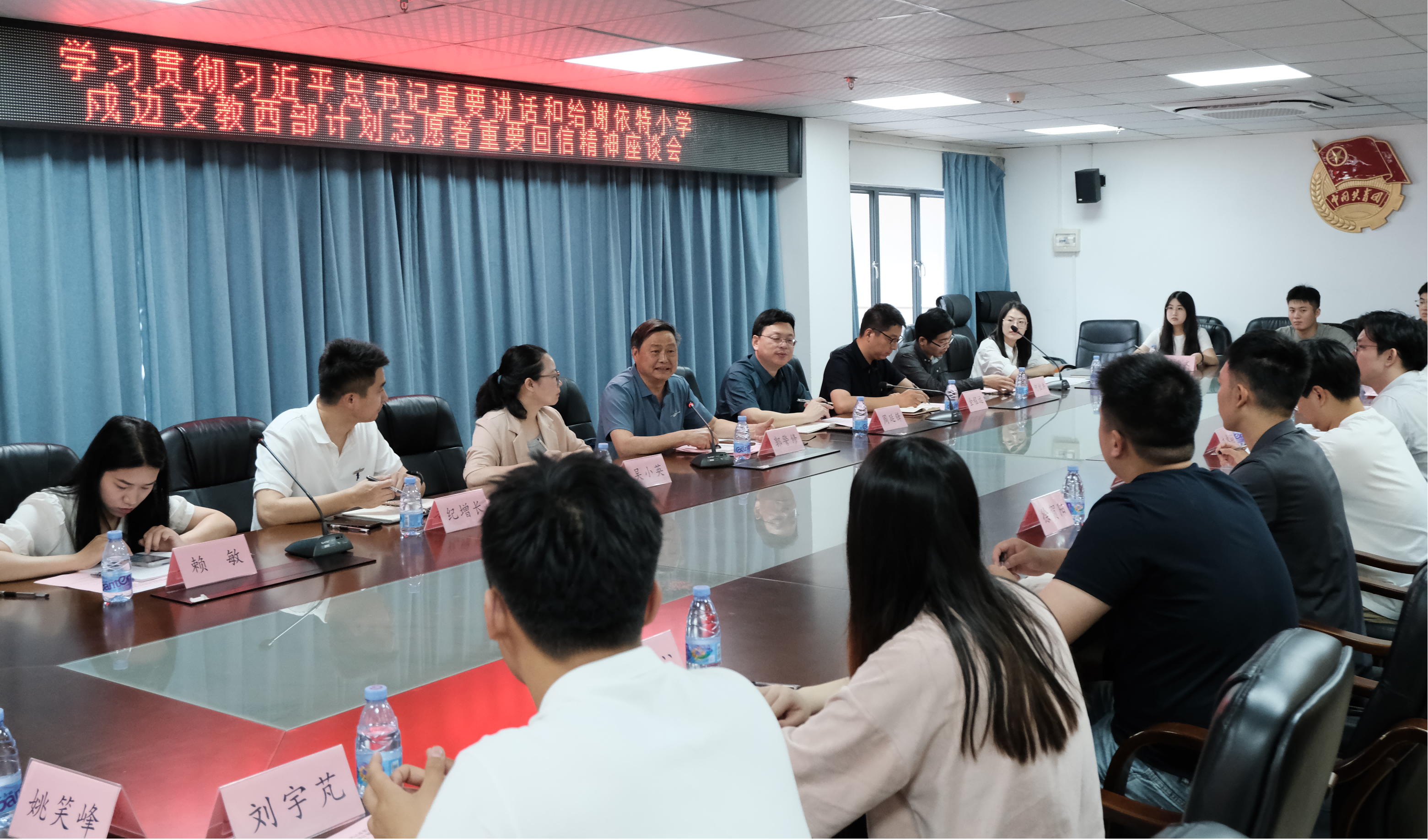 5月9日,校团委召开学习贯彻习近平总书记重要讲话和给谢依特小学戍边支教西部计划志愿者重要回信精神座谈会。校关工委副主任郭警修,校团委书记周延锋、副书记吴小英以及学院团委书记代表,西部计划志愿者代表、学生代表共同参会。