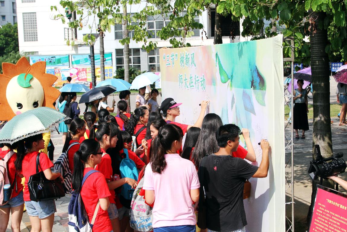 仪式结束后,参加活动的500名师生在签名墙上签名承诺:从我做起,践行“三节”。校“三节”学生督导队分成若干小组,对食堂、宿舍、教室等地进行了督导检查。