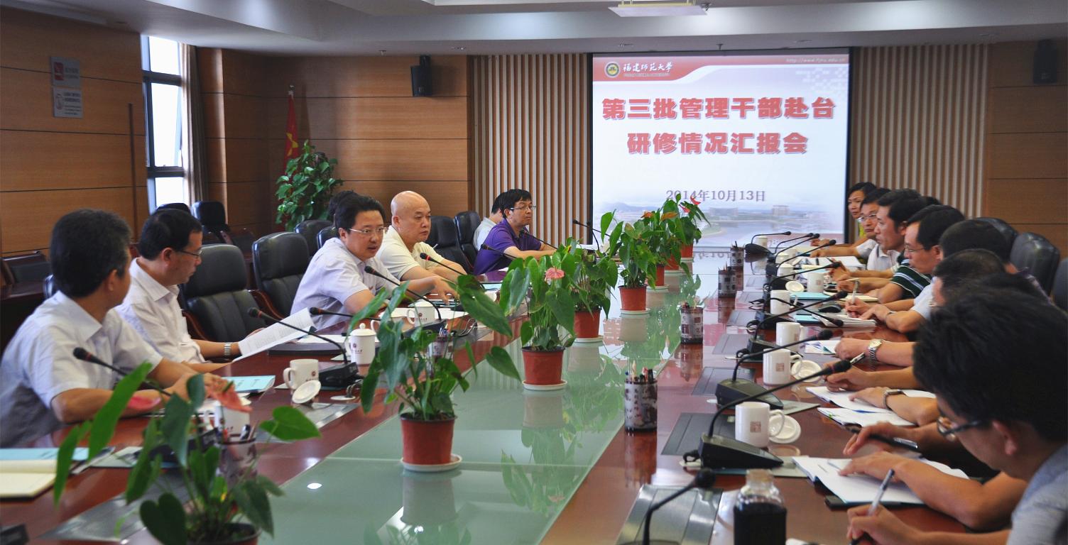 会上,第三批赴台研修管理干部汇报了在台湾高雄师范大学研修情况,并围绕台湾高校的校务管理、师资队伍建设、教学科研管理、技职教育、终身教育、学生工作特色等作了专题汇报。