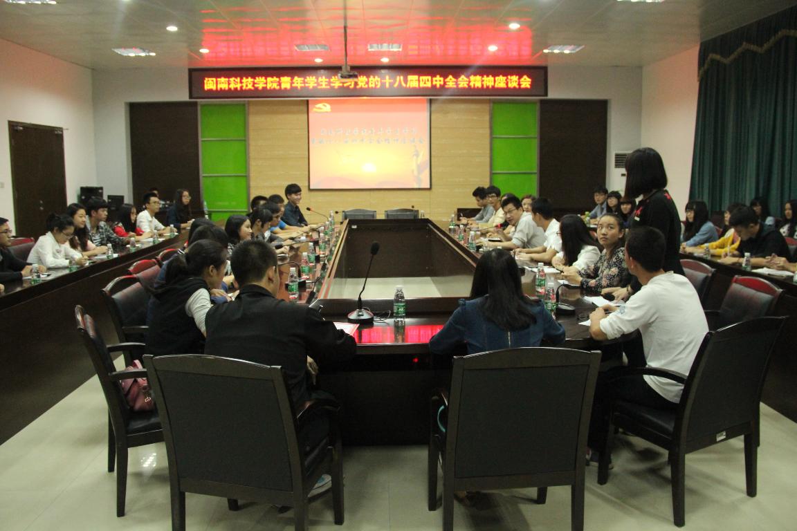 闽南科技学院于10月28日召开座谈会,观看学习党的十八届四中全会会议背景、会议议程、会议公报等视频,各级团委、学生会代表结合四中全会的精神和自身的学习工作实际谈了体会,大家一致认为,党的十八届四中全会的召开对全面推进依法治国具有“里程碑”意义,为建设法治国家描绘了新的路线图,对于做好今后的工作,具有很强的现实指导意义。大家表示有完善科学的制度体系,才能更好得开展工作,做到理论与实践相结合。会议还对下一阶段团学组织学习宣传贯彻党的十八届四中全会精神做了部署。