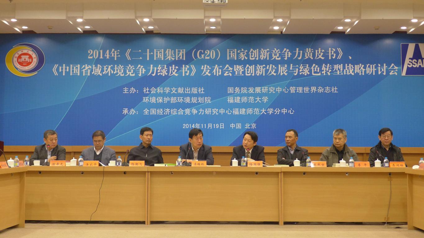 李培林副院长、隆国强主任、杨朝飞总工程师分别在会上致辞,他们对第三部《二十国集团(G20)国家创新竞争力黄皮书》和《中国省域环境竞争力绿皮书》的出版表示热烈祝贺,认为最新发布的这两部皮书及时适应了当前国际国内经济发展的要求,紧扣“创新”和“环境”这两个关键发展议题,分别对G20各成员国的国家创新竞争力、中国省域环境竞争力进行了深度的比较分析,并提出了相应的战略建议,这为世界各国和我国各级政府不断挖掘新的增长动力,加快经济绿色转型,提高经济发展质量和效益,提供了重要的分析依据和决策参考借鉴,这两项研究已处于我国在该领域的领先水平。李闽榕教授、黄茂兴教授分别代表课题组对2014年《二十国集团(G20)国家创新竞争力黄皮书》和《中国省域环境竞争力绿皮书》的研究内容作了主题报告。潘家华、李平、肖金成、王金南、林跃勤等专家纷纷对两部皮书的出版表示热烈祝贺,并作了精彩的发言。