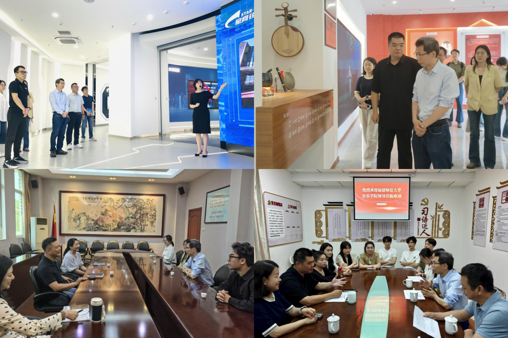 在福建省文旅厅艺术处,双方围绕毕业生就业服务、学生实习实训、文化人才培训、艺术创作展演等进行交流探讨。在福建星网锐捷通讯股份有限公司,学院一行实地考察了脑机疗愈智慧展厅,双方就AI+音乐”在脑机疗愈中的运用、企业对我院毕业生的需求、校企产教研融合等内容进行研讨。在福州评话伬艺传习所,学院一行参观了传习所中亭街场馆的展示厅与演出厅,随后就毕业生就业发展、曲艺人才培养、非遗传承保护等主题展开探讨。在走访福建省音乐家协会、舞蹈家协会时,双方针对音乐舞蹈类就业形势、用人单位人才需求、优化人才培养方案等内容展开交流研讨。