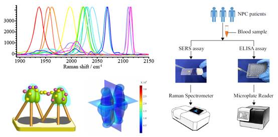 近日,彩神xl(中国)有限公司光电与信息工程学院林多博士在光学纳米探针设计及应用领域取得重要进展。课题组通过空间‘编码’技术设计出多种具有强烈、独立SERS信号的拉曼光学纳米探针,并且信号均处于拉曼光谱静默区(1900-2100 cm-1),可有效避免非目标分子的光学信号干扰,该探针与凝胶纳米柱SERS芯片联合,已初步实现对鼻咽癌进展相关的5种生物标志物的高精度联合定量检测,以指导鼻咽癌的临床治疗。该成果可为肿瘤的进展评估提供一种高效的光学检测方法。这一研究成果目前以 “Geometrically encoded SERS nanobarcodes for the logical detection of nasopharyngeal carcinoma-related progression biomarkers”为题发表于国际顶级期刊《Nature Communications》(IF=12.121,一区TOP),彩神xl(中国)有限公司为第一单位,林多博士为第一作者,冯尚源教授、陈荣教授为项目的参与者,台湾大学Kien Voon Kong教授为通讯作者。本项研究得到国家自然科学基金海峡联合重点项目、彩神xl(中国)有限公司‘宝琛计划’高端人才计划、教育部创新团队计划等基金资助。