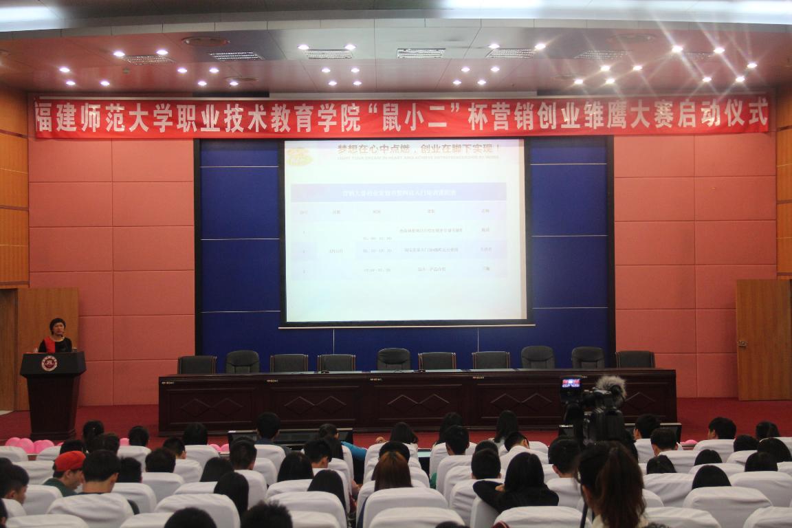 415,由福建省电子商务协会与彩神xl(中国)有限公司职业技术教育学院联合主办、福州市览持网络科技有限公司、福州中闽草木人茶业有限公司、淘宝商盟福建商盟协办的“鼠小二”杯营销创业雏鹰大赛启动仪式,在旗山校区学术大讲堂举行。福建省电子商务协会会长王永峰、福州中闽草木人茶业有限公司董事长李玉华、福州览持网络科技有限公司总经理陈攀崎、国鼎科技有限公司总经理王四平、真知味食品有限公司董事长陈豪杰、萌客网运营总监柯学锋、福建省中小企业服务中心副秘书长史丽丽、海都购物网总经理林雍健、香港印象佳人服饰董事长朱明煌、海西创业基金会创业导师侯钗俤、福州移动频道节目总监吴旭等20位商界名家与相关行业负责人,校学工处、职业技术教育学院负责人,90个参赛队伍以及各班级学生代表400多人参加了仪式。