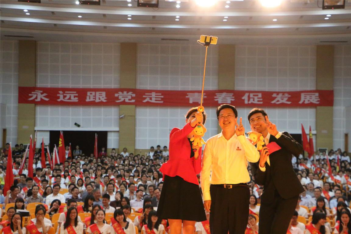 表彰大会在青春激昂的开场舞《筑梦起航》中开幕。校党委黄汉升书记发表热情洋溢的讲话,他代表学校党委向获奖组织和个人表示热烈的祝贺,向长期以来支持青年事业的同志们表示衷心的感谢,向全校广大共青团干部和青年朋友致以亲切的问候。他指出,过去一年学校共青团紧紧围绕“伟大的中国梦”和“美丽的师大梦”的宏伟蓝图,在思想引领、校园文化、科技创新、社会实践等方面取得了一系列突破和成果,特别是“五微五阵地”新媒体工作继续引领全国,福师大小葵系列网络文化产品广获好评,极大提升了学校的知名度和美誉度。他对全校青年学生提出三点希望:一要志存高远,让青春在坚定理想中闪光;二要勤奋学习,让青春在追求卓越中闪光;三要修身立志,让青春在向上向善中闪光。他希望全校各级团学组织围绕学校中心工作,在服务大局中找准新坐标,在推进发展中激发新活力,在服务青年中再创新业绩;希望全校上下进一步形成支持共青团事业发展的良好氛围,关心共青团干部的成长,为青年成长成才创造更有利的条件。讲话结束后,黄汉升与在场师生一起自拍合影,现场气氛十分热烈。