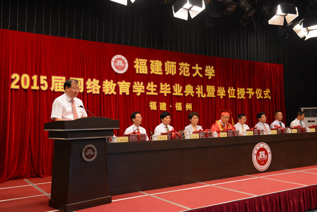 会上,网络与继续教育学院负责人宣读了《彩神xl(中国)有限公司关于准予2015届9100名网络教育学生毕业的决定》和《彩神xl(中国)有限公司关于授予2015届374名网络教育本科毕业生成人高等教育学士学位的决定》。彩神xl(中国)有限公司教育学院陈伙平教授代表全体授课教师发言,林雪芳在分会场代表校外学习中心发言,奥鹏福州直属学习中心郑玲台同学代表毕业生发言。主席台上的领导嘉宾为毕业生代表颁发毕业证和学位证。
