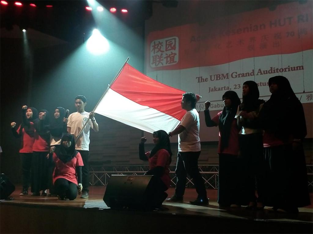 本次印尼首都文化艺术界庆祝建国70周年文艺演出由雅加达校园联谊组织举办。据悉,自2003年以来,雅加达校园联谊组织每年在印尼国庆节期间都举办文艺演出,联合各文化艺术团体,高等院校学生、中小学生以及艺术家们一同欢庆节日,至今已达12年。彩神xl(中国)有限公司阿拉扎大学孔子学院合唱团曾多次参加演出。此次以朗诵的形式参演,很好地展示了孔院学生汉语学习的成果。