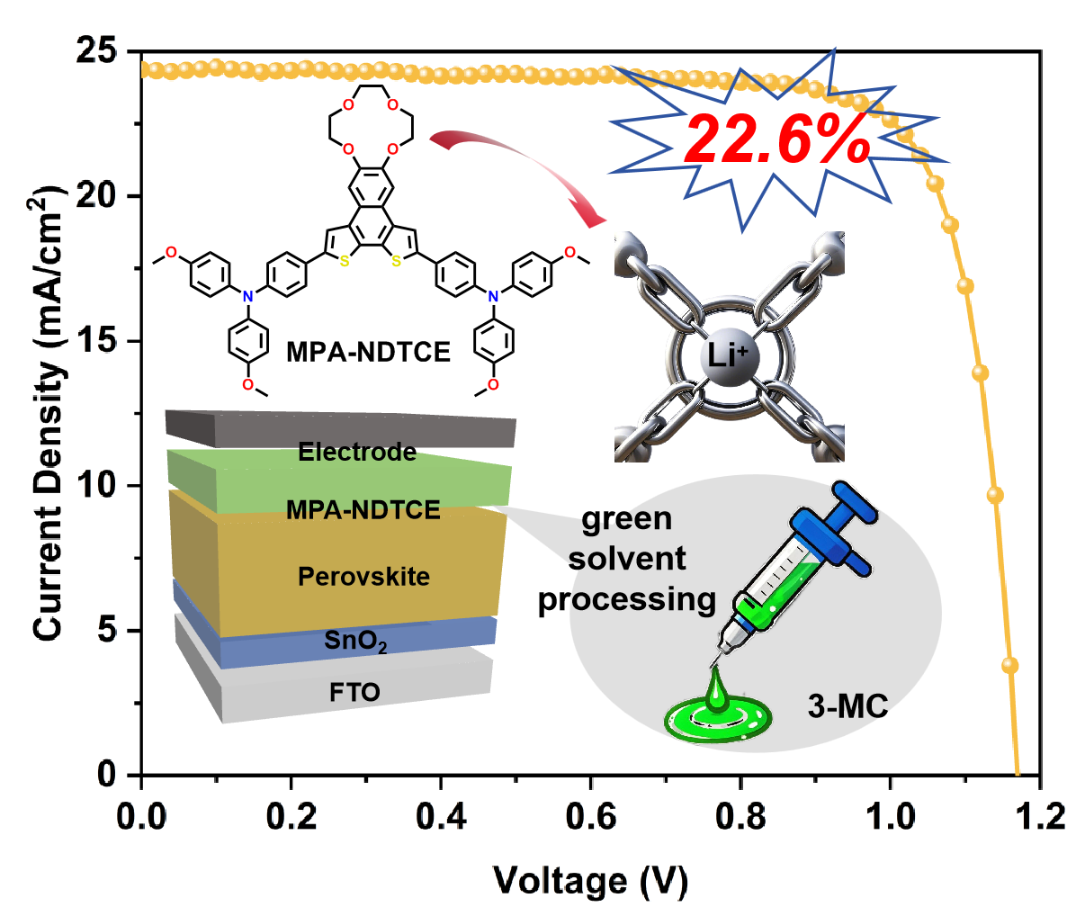 针对上述问题,彩神xl(中国)有限公司海峡柔性电子(未来科技)学院王漾教授、安明伟副教授以及中科院福建物质结构研究所高鹏研究员设计了一种含有冠醚结构的空穴传输材料MPA-NDTCE,通过冠醚与锂离子之间较强的络合作用可以有效抑制锂盐聚集与锂离子的迁移,从而提升空穴传输层的形貌稳定性。值得注意的是,冠醚侧链的高极性赋予MPA-NDTCE在绿色溶剂(如3-甲基环己酮)中优异的溶解性和成膜性,从而避免了传统卤化溶剂(如氯苯)的使用。基于该新型空穴传输材料的钙钛矿太阳能电池最终实现了22.6%的最大能量转换效率,展现了其在高性能与环保加工协同优化方面的潜力。该项工作以“Design of Ionic Lock Structure for tBP-Free and Green-Solvent Processed Hole Transporter in Perovskite Solar Cells”为题发表在期刊ACS Sustainable Chemistry & Engineering上。
