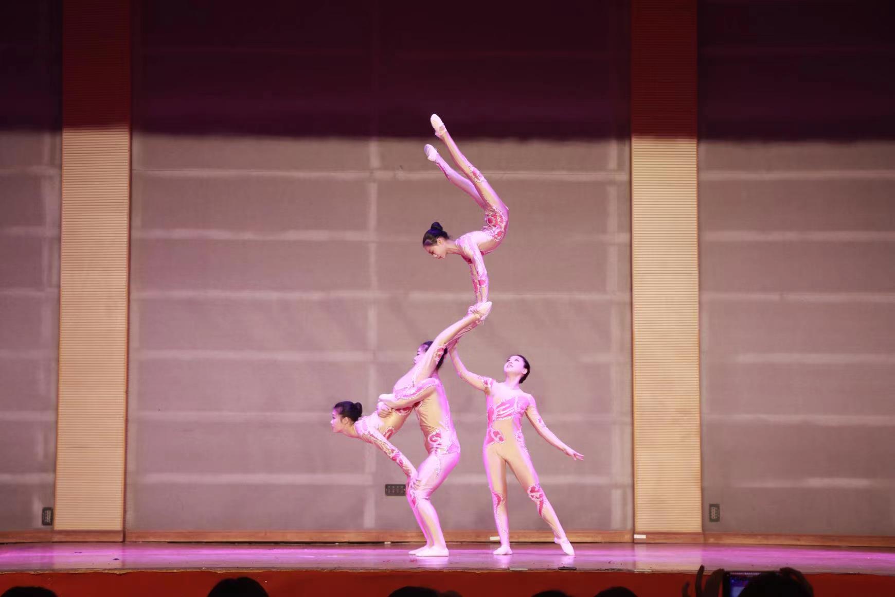 开场节目《欢欣鼓舞--蹬鼓》点燃了整场演出活跃、喜庆的气氛;单杆表演“漫步行走”“柔术造型”等展现了力量之美;滑稽类节目《顶茶缸》演员来到观众席表演,在同学们热烈的欢呼声中将现场气氛推向高潮;传统经典节目《绳技》意境优美。此外,地圈、软工、空竹等传统杂技轮番上阵,演职人员用深厚的表演功底和高超的技艺给现场观众带来了一个个精彩绝伦的节目。