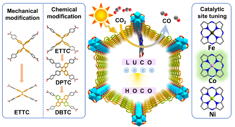 近日,彩神xl(中国)有限公司张亮亮副教授课题组合成了一种基于四苯乙烯的柔性Zr-MOF(PCN-128),并以PCN-128为平台展开化学与机械双重改性修饰,期望提升材料在光催化CO2还原活性。机械力诱导压致变色行为,而连续的合成后环化反应扩展了PCN-128内芳香配体的π共轭,将PCN-128转化为PCN-130,显著调节了材料的能带结构与可见光吸收能力。在整个PSM过程中实现了单晶到单晶的转变,为深入理解构效关系提供了重要依据。此外,将金属酞菁的羧基配体(M-TcPC,M=Fe、Co、Ni)引入框架中,提供了额外的催化位点,进一步提高了CO2还原活性。通过优化光敏剂与催化位点的比例,改性催化剂在可见光照射下实现了高达838μmol·g-1·h-1的CO2还原速率。本研究强调了柔性MOFs材料机械和化学改性的潜力,系统揭示了MOFs柔性在能带调控与催化性能优化中的关键作用,为柔性MOFs材料在太阳能转化与可持续能源发展中的应用提供了新思路。该工作以“Chemical and Mechanical Modifications of Flexible Metal-Organic Frameworks for Enhancing Photocatalysis”为题发表于Chemical Science上。